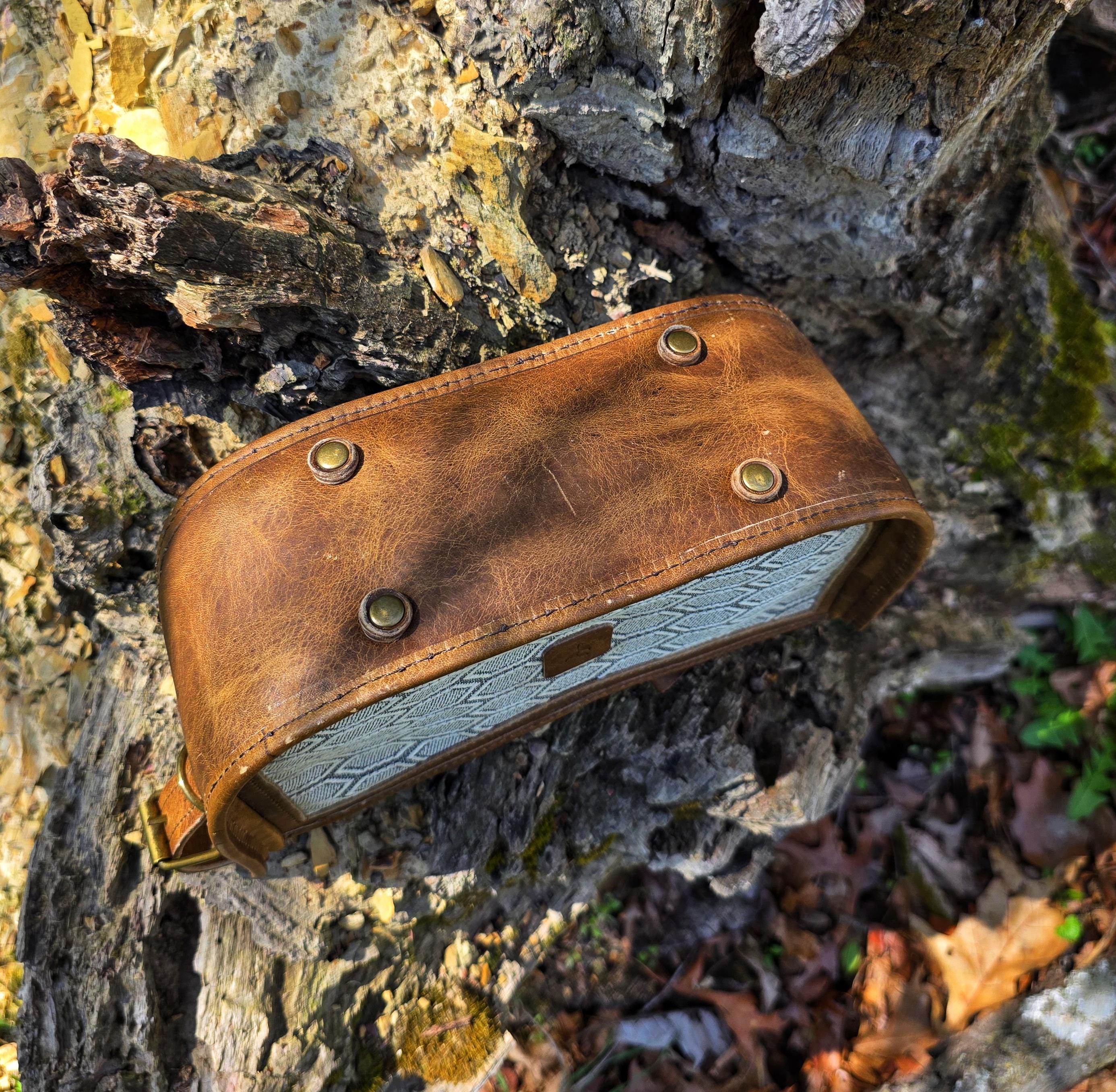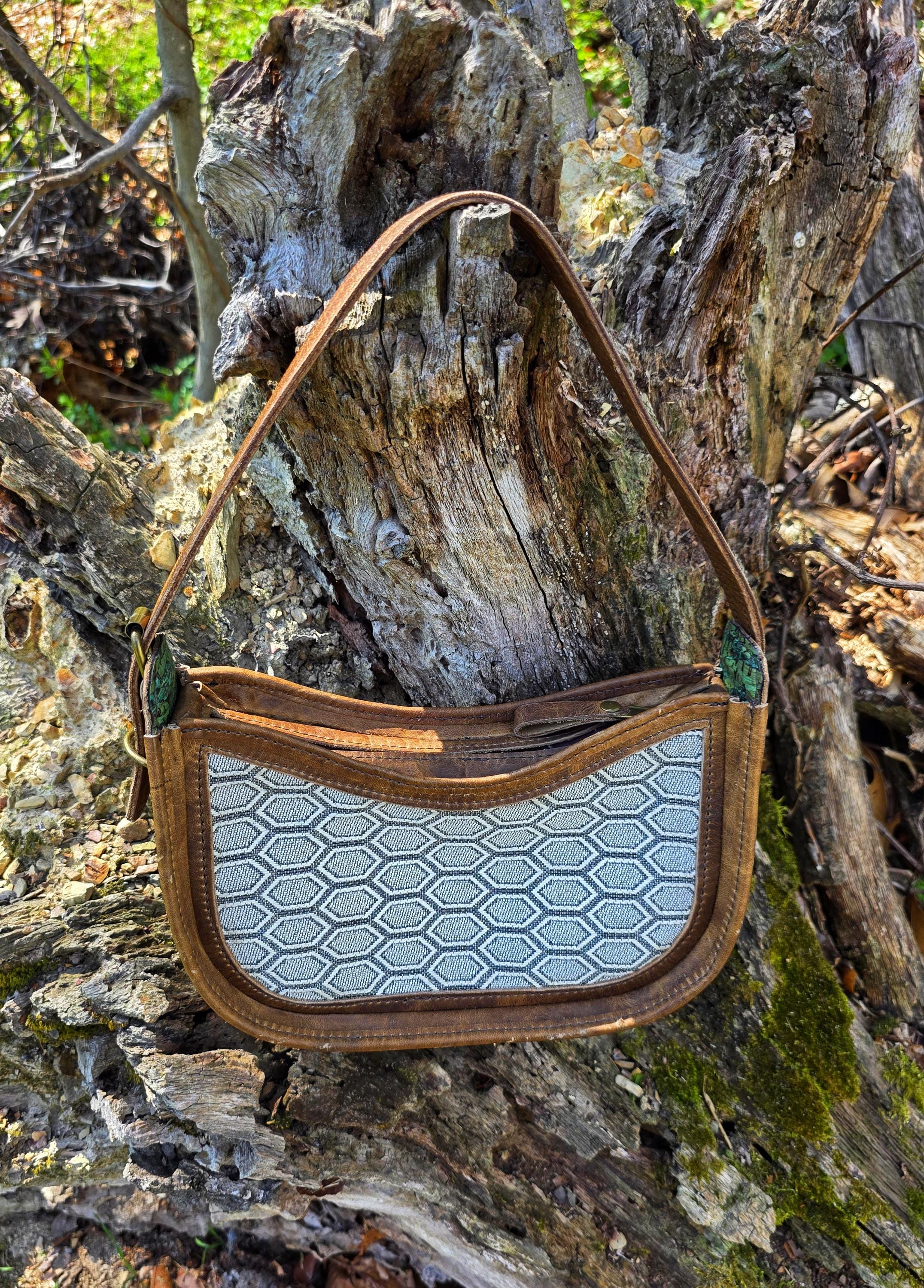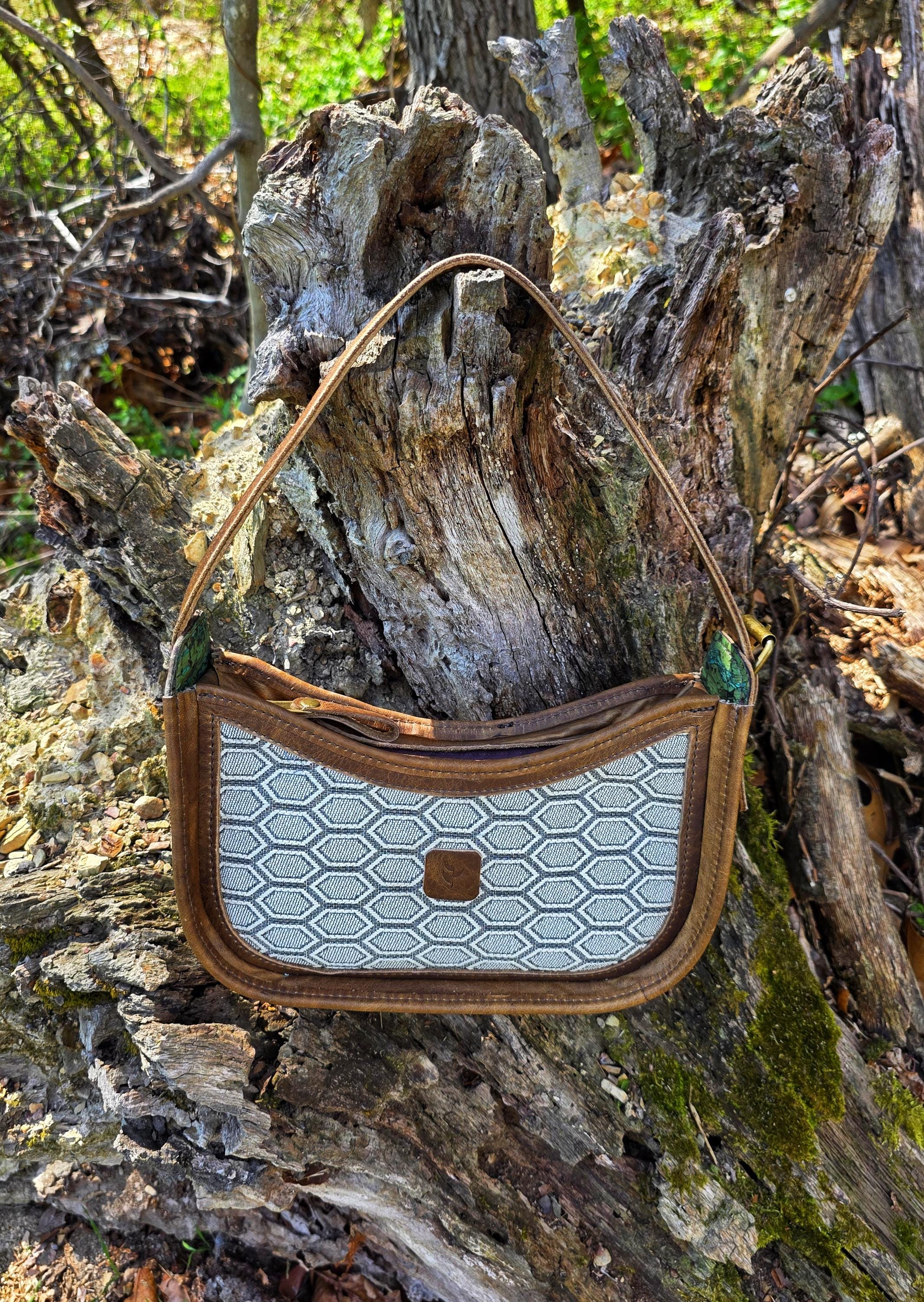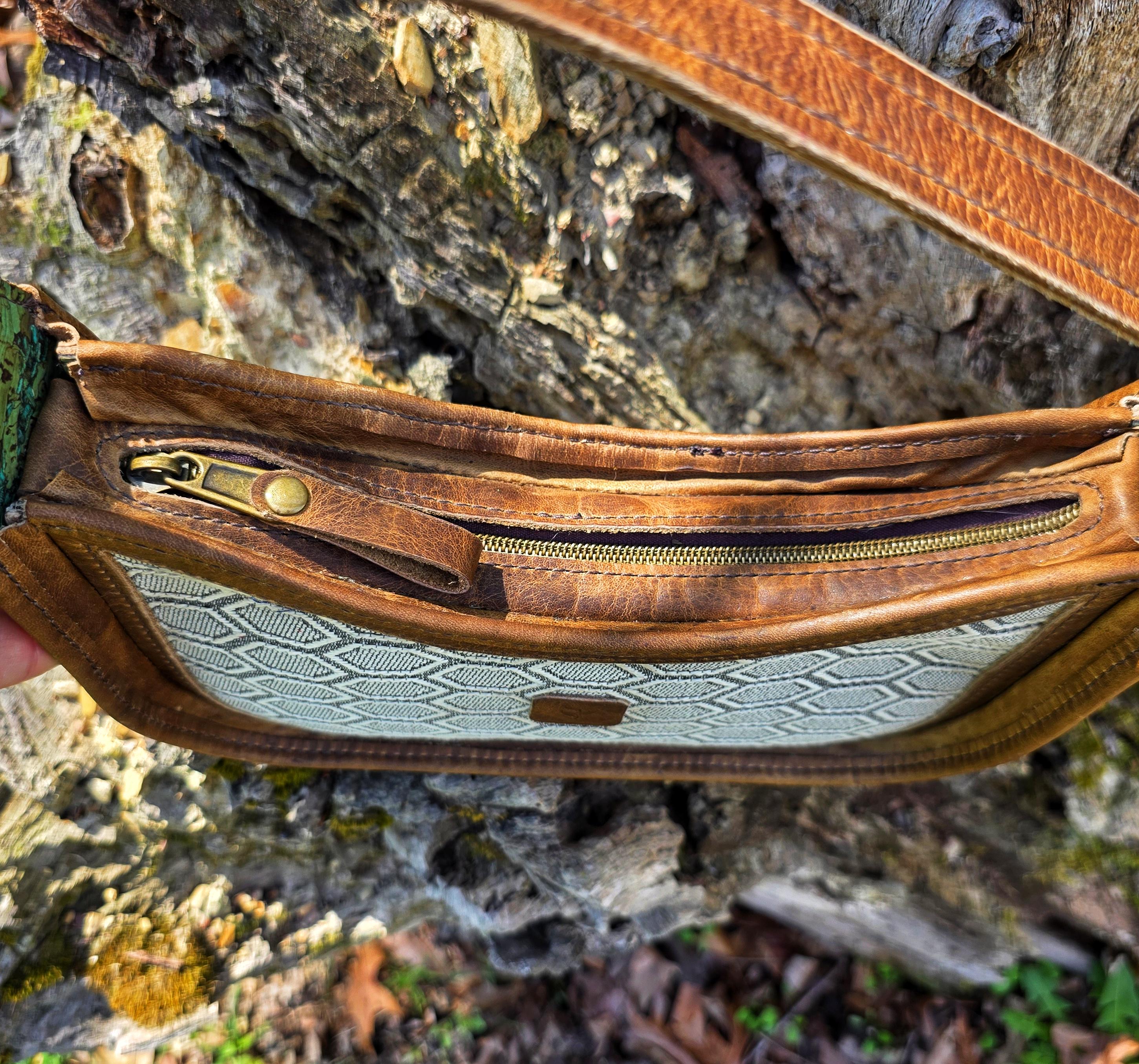 Introducing our extraordinary Mixed Medium Vintage Oil Tan Leather Baguette, a true blend of style and durability. This exquisite baguette combines vintage oil tan leather with a touch of sage green hexagonal vintage fabric in the side panels, creating a captivating and unique accessory that is sure to make a statement.