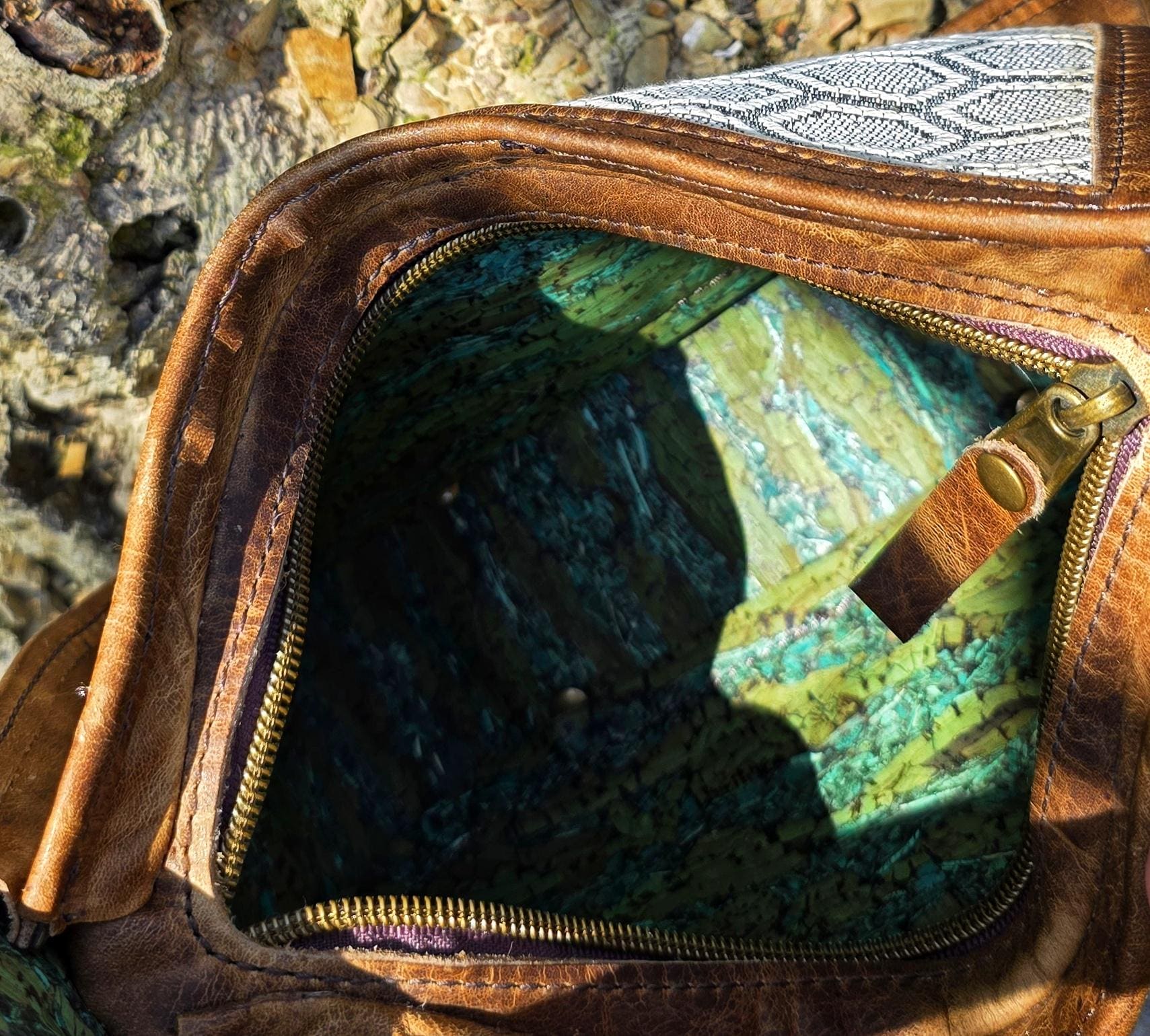 Step inside, and you'll be delighted by the snazzy green 100% cork lining. The vibrant green color adds a pop of personality, while the cork material offers a durable and eco-friendly solution. Cork is known for its exceptional resistance to wear and tear, ensuring that your belongings stay protected and secure. This trifecta of materials creates a robust purse that can effortlessly handle any fancy outing or serve as an everyday carry.
