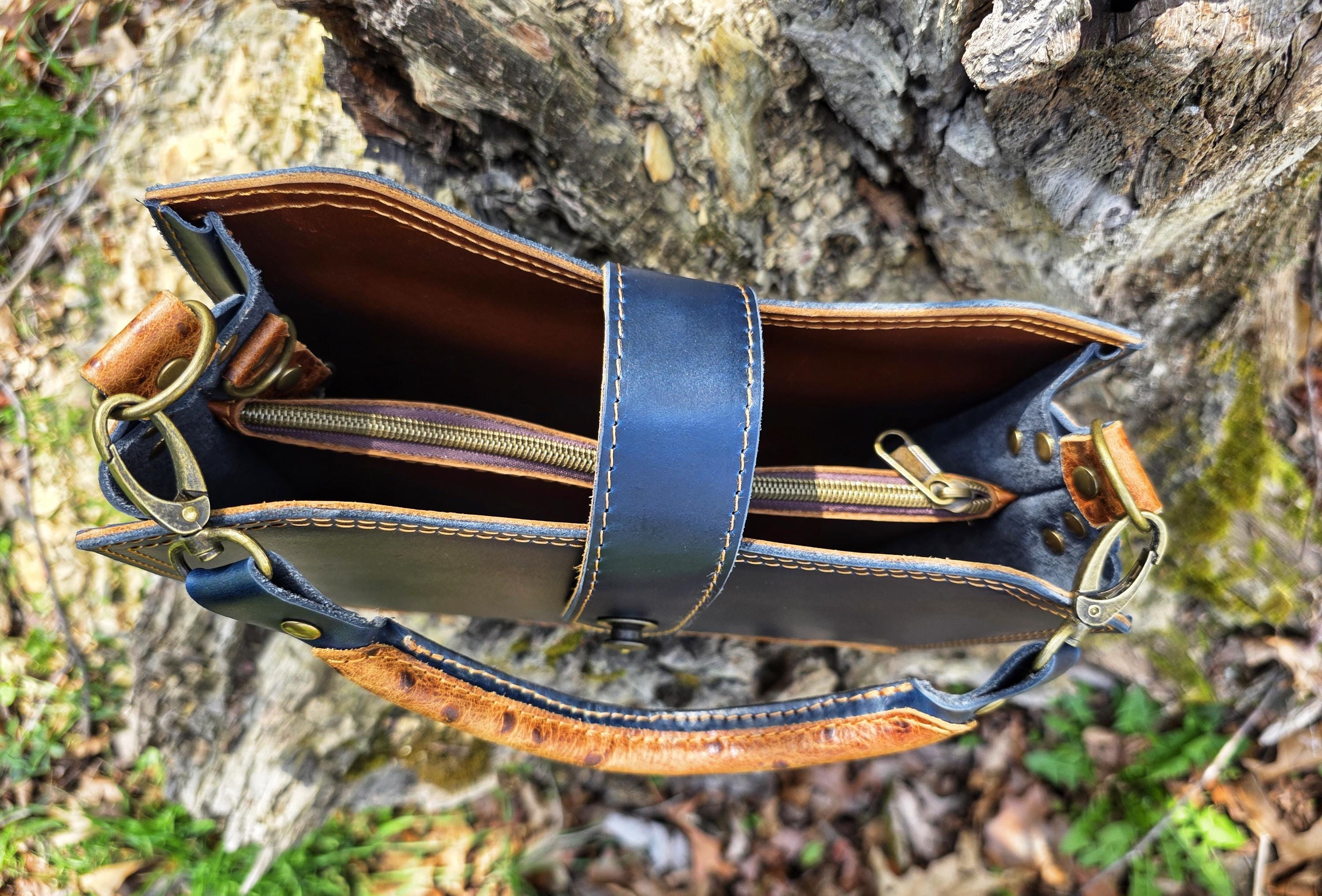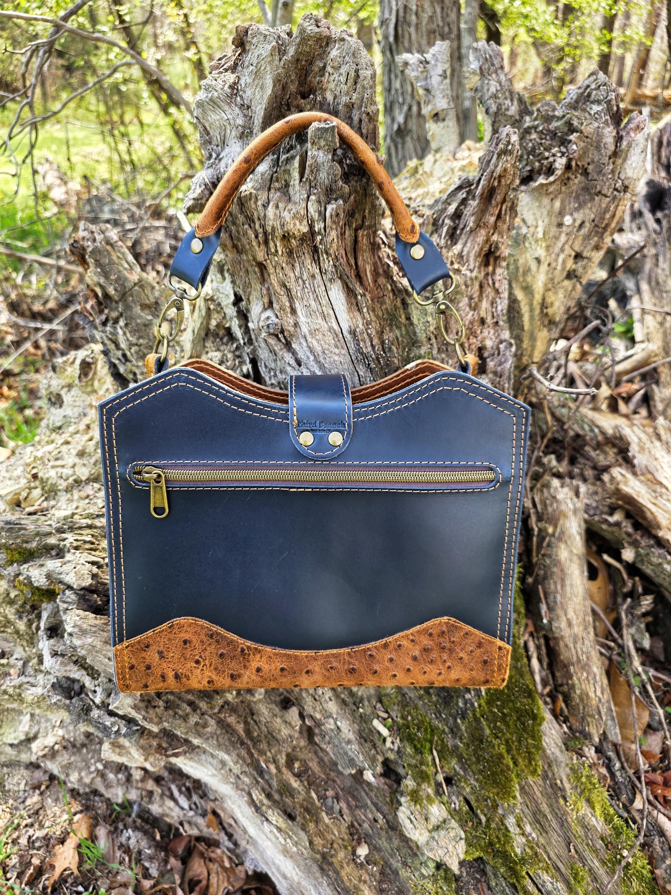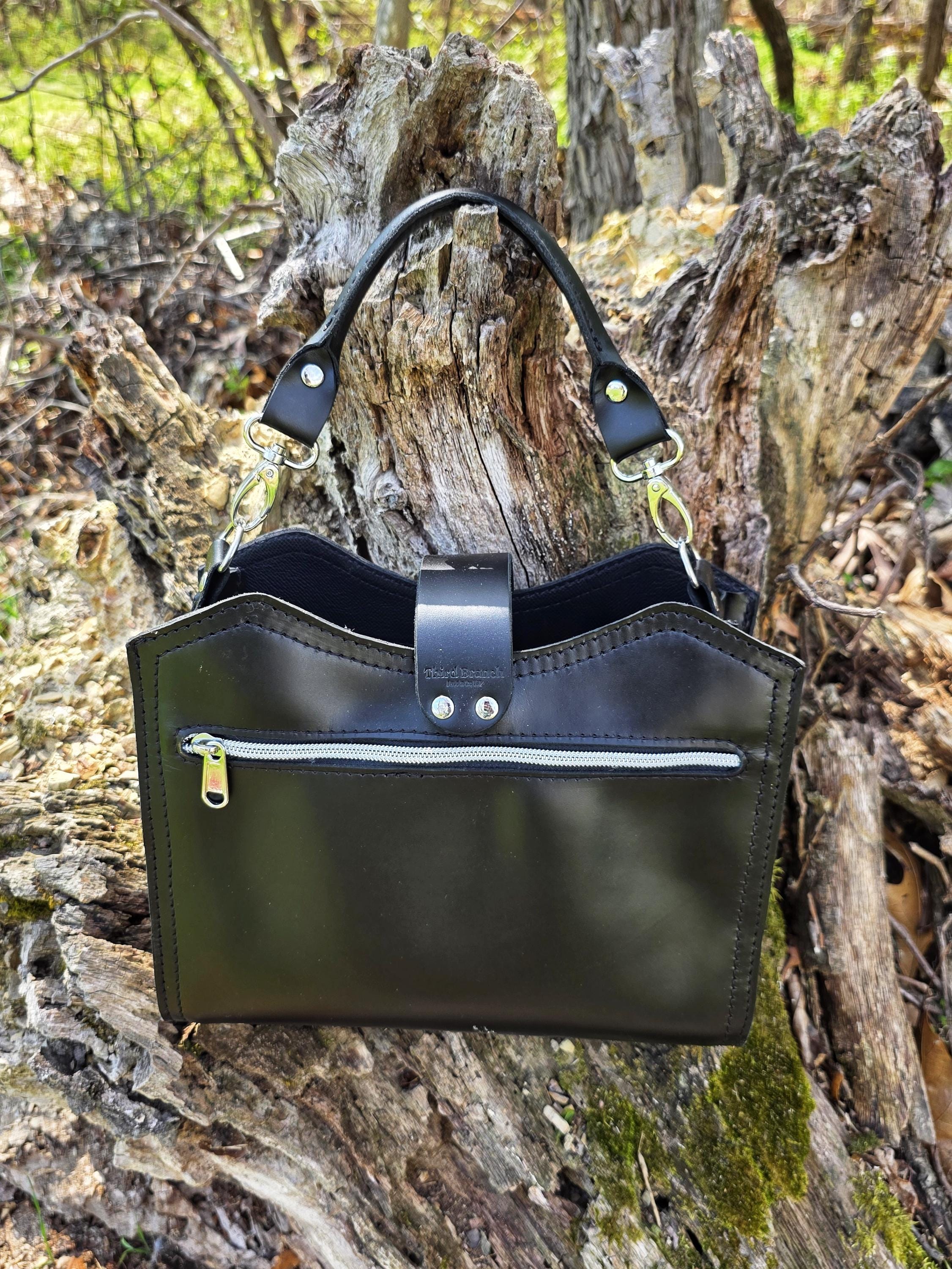 These classic leather handbags are approximately 9" tall x 10.5" wide x 3.5" deep. It has a leather handle, inside/outside zipper pockets, and a place to clip your keys.