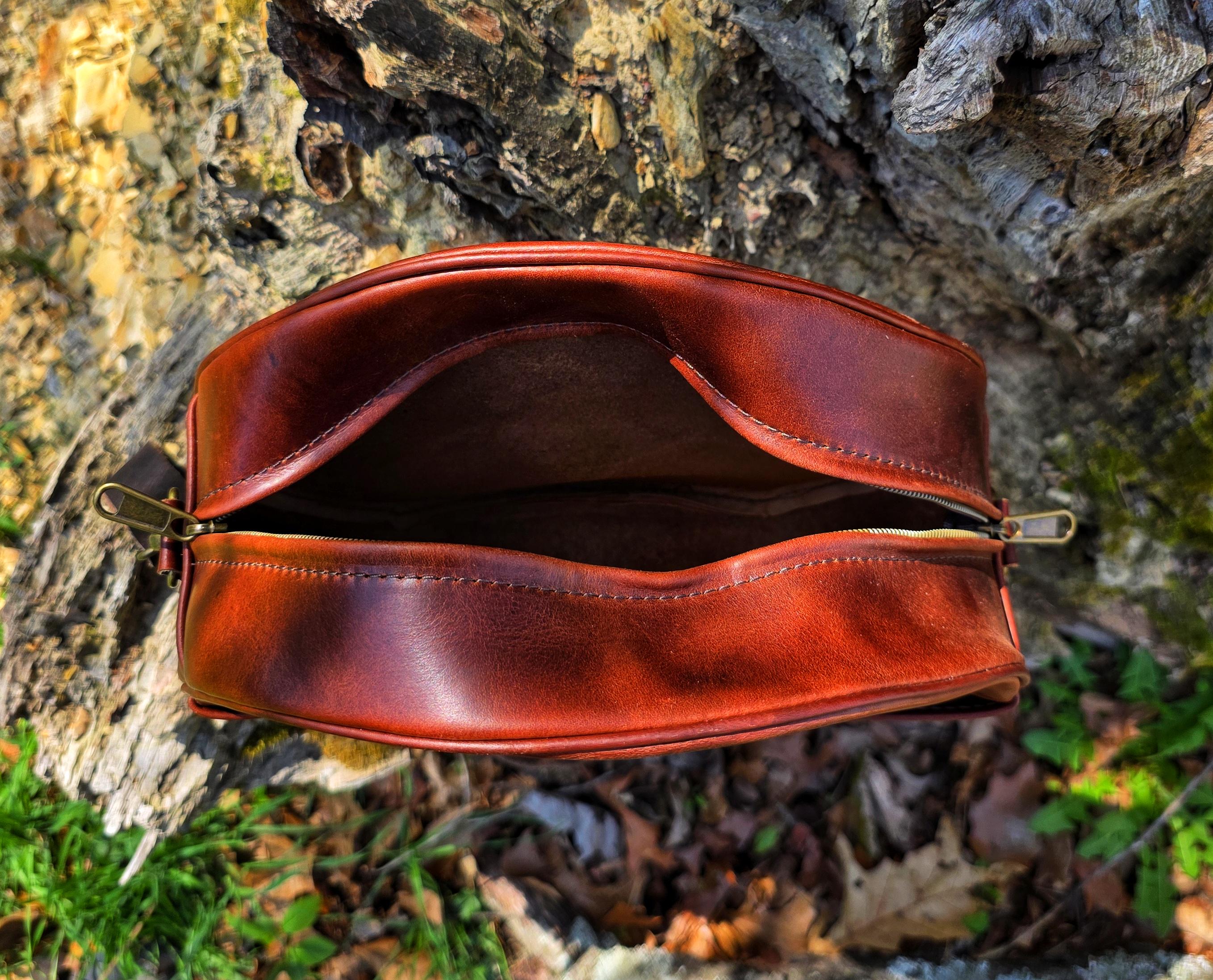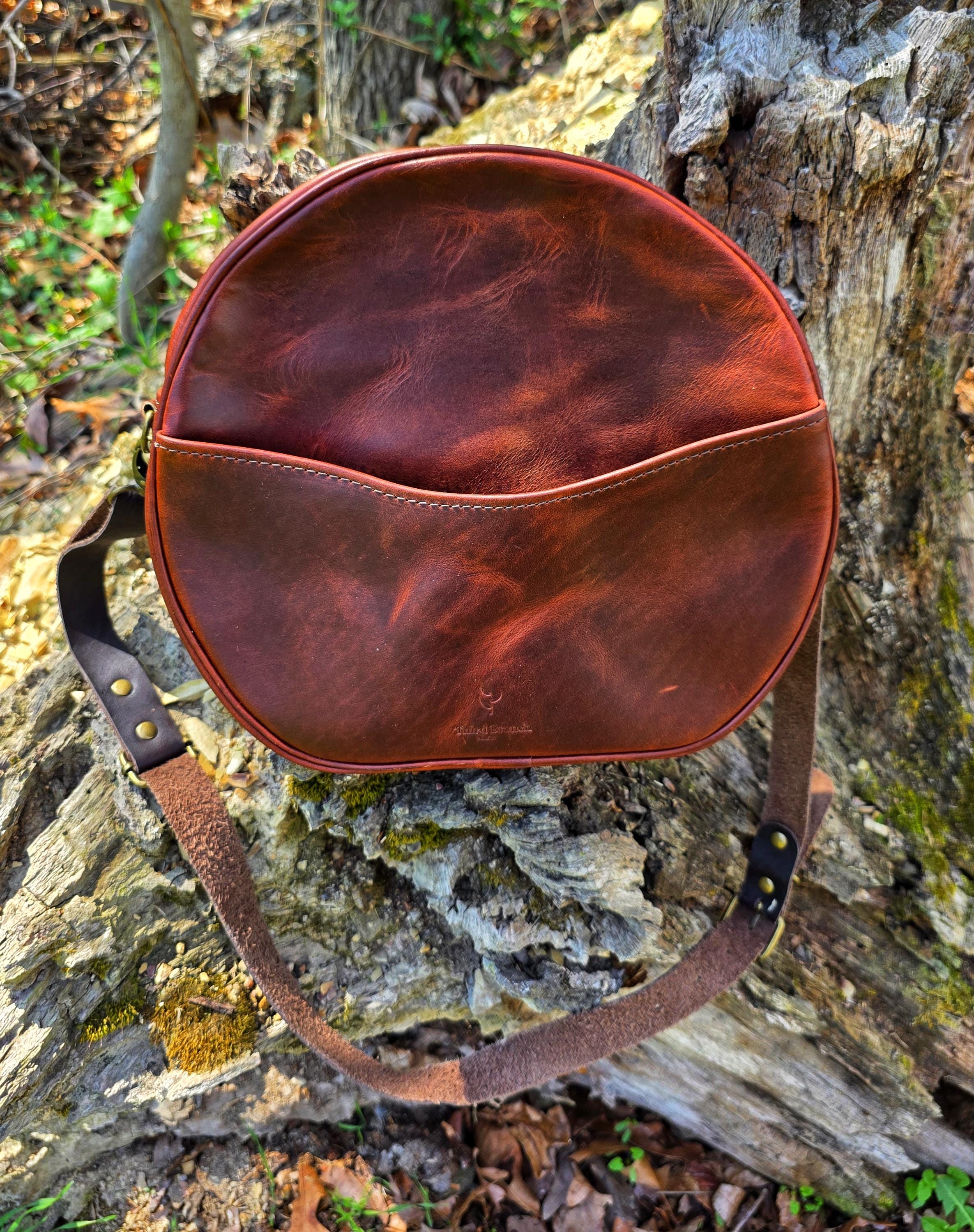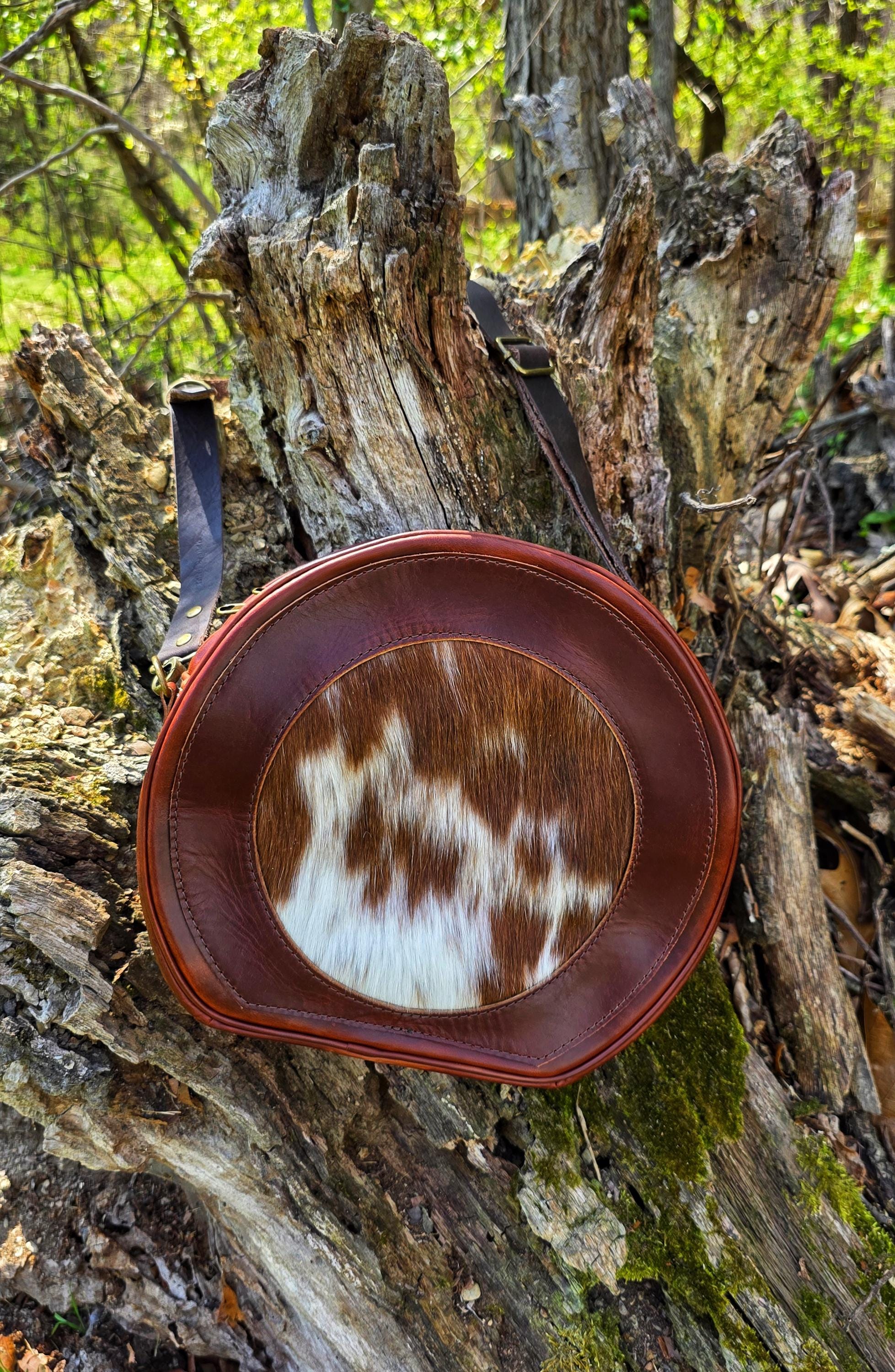 This Hair-on western canteen bag is approximately 10" tall x 11" wide x 5" deep. It has a leather shoulder strap, outside pocket, and a built in sensory place to rub (the hair).